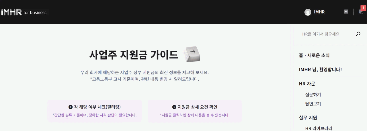 ์ฃผ ์ง์๊ธ ๊ฐ์ด๋๋ฅผ ์ ๊ณตํฉ๋๋ค. IMHR์ด ์ ๊ธฐ ๋ชจ๋ํฐ๋งํ์ฌ ์์ ์๋ดํ๋ฉฐ, ์ง์๊ธ๊ณผ ๊ด๋ จํ ์ ๋ ์๋ฌธ์ ์ง์ํฉ๋๋ค.